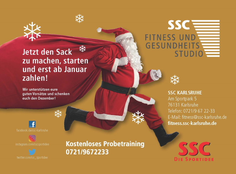 Die SSC-Geschäftsstelle ist in den Weihnachtsferien von Montag, 22. Dezember 2025 bis Montag, 05. Januar 2026 von 10.00 - 12.00 Uhr geöffnet, nachmittags geschlossen! An Feiertagen ist die Geschäftsstelle komplett geschlossen.